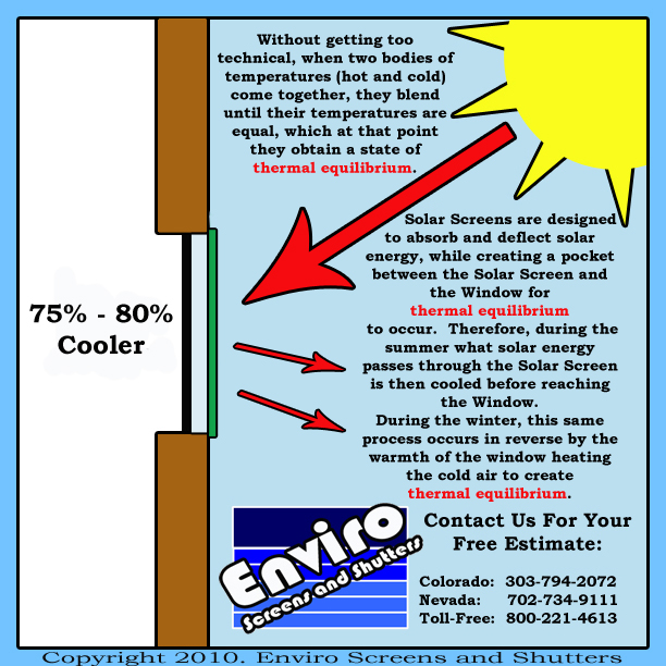 Enviro Solar Screens block the sun's heat and prevents drapes, carpet and furniture from fading and sun rot. Our Solar Screens work with your windows open or closed. They won't crack, peel, bubble, or obscure your view. They provide excellent outward visibility and daytime privacy and security. Our screens stop insects, but not the breeze.